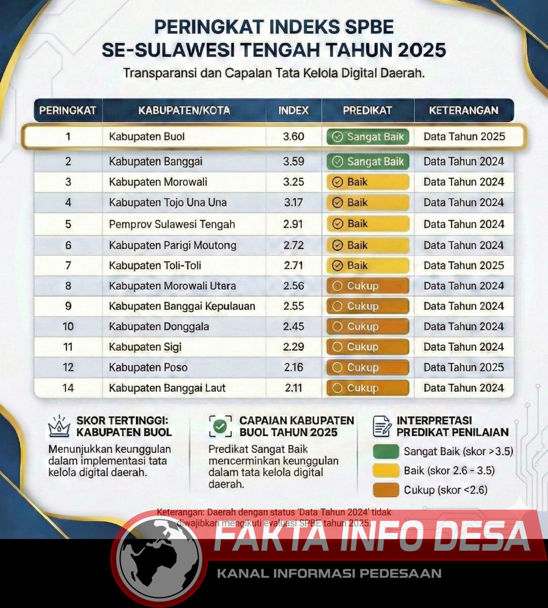 PALU, FAKTAINFODESA – Tata kelola digital di wilayah Provinsi Sulawesi Tengah menunjukkan perkembangan signifikan pada tahun 2025. Berdasarkan rilis data Peringkat Indeks Sistem Pemerintahan Berbasis Elektronik (SPBE), Kabupaten Buol berhasil mengukuhkan posisinya di peringkat pertama dengan skor tertinggi di seluruh provinsi.