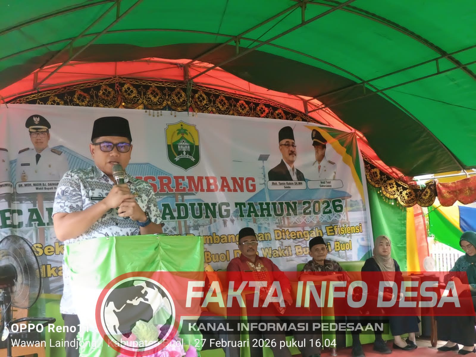 BUOL,FAKTAINFODESA – Bupati dan Wakil Bupati Kabupaten Buol menghadiri secara langsung Pembukaan Musyawarah Rencana Pembangunan Daerah (Musrenbang) Tingkat Kecamatan Gadung yang berlangsung pada hari Jumat (27/2) di desa Taat Kecamatan gadung, Acara dihadiri oleh jajaran Forkopimda, Sekretaris Daerah, Para Asisten dan Staf Ahli Bupati, Kepala OPD se-Kabupaten Buol, Staf Khusus Bupati, perwakilan Polsek Bunobogu, Koramil, para Kepala Desa dan Ketua Badan Permusyawaratan Desa (BPD) beserta perangkat dan aparat desa se-Kecamatan Gadung, serta perwakilan Tokoh Pemuda, Tokoh Masyarakat, rekan jurnalis/media, dan sejumlah masyarakat lokal.